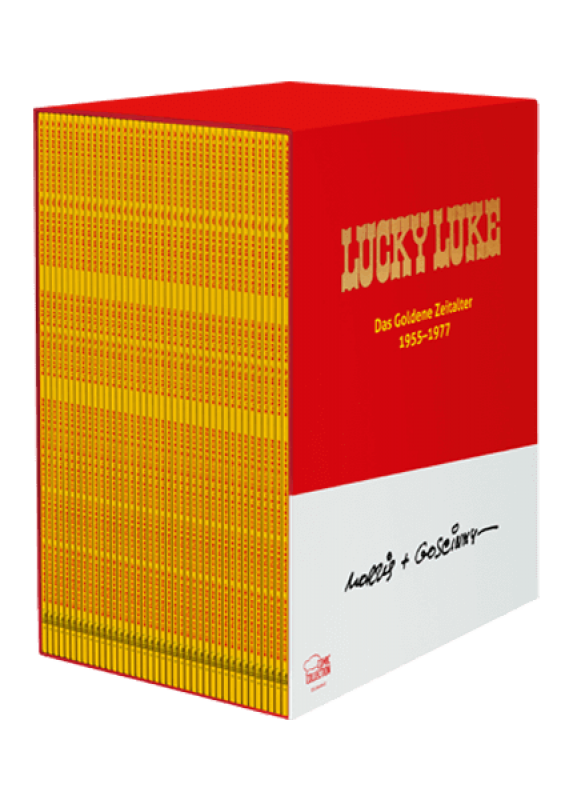 Die „Goldene Ära“ des lonesome Cowboy Lucky Luke ist zweifelsohne die Zeit der Zusammenarbeit des Lucky-Luke-Erfinders Morris mit dem genialen Szenaristen René Goscinny. Diese Zusammenarbeit dauerte von 1955 bis zum unerwartet frühen Tod Goscinnys 1977 an. Währenddessen entstanden Klassiker der Reihe wie „Billy the Kid“, „Stacheldraht auf der Prärie“ und „Joss Jamon“ mit dem ersten Auftritt der vier Dalton-Brüder, die zu einem wiederkehrenden und prägenden Element der Reihe werden sollten. Diese Klassiker prägten das (zugegebenermaßen humoristisch verfremdete) Western-Bild von Millionen Bundesbürgern, wie es sonst nur Filme mit Hollywood-Legenden wie Fonda, Cooper, Stewart, Wayne & Eastwood vermochten. Diese Luxusbox erscheint anlässlich des 75. Jubiläums von Lucky Luke und enthält 40(!) Alben mit allen Luke-Geschichten, die Morris und Goscinny gemeinsam verfasst haben.