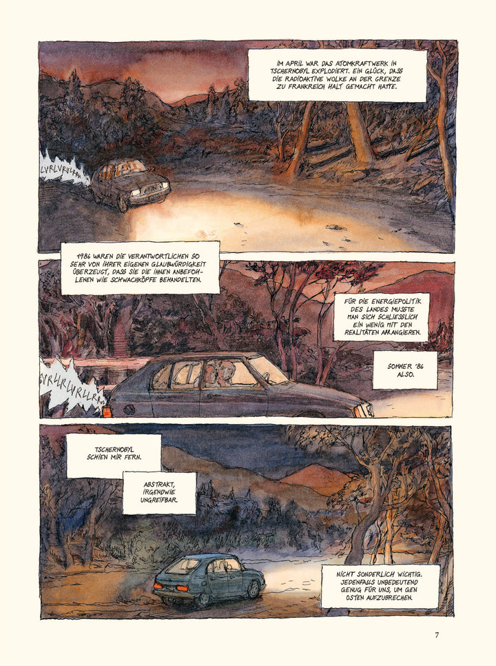 Im Sommer 1986, ein paar Monate nach dem Atomunfall von Tschernobyl, fällt den 20-jährigen Cousins Nicolas und Guy ein schrottiger Citröen Visa in die Hände. Sie stopfen ihn voll mit Büchern, die ihnen etwas bedeuten, die sie aber nicht lesen werden – Michaux, Kafka und Diderot – legen zwei Schlafsäcke und Zigaretten obendrauf… und ab geht die wilde Reise nach nirgendwo, Hauptsache: Ganz. Weit. Weg.