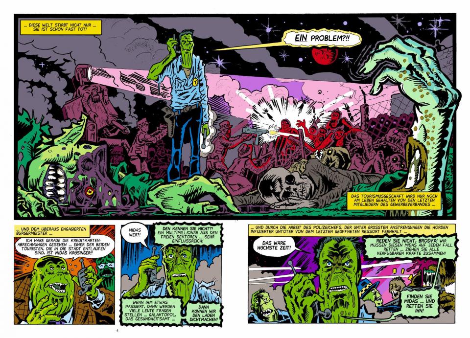 Die Lage auf dem Urlaubsplaneten eskaliert: Während Sönke Penner und Grok in einem Getränkemarkt von mutmaßlichen Alien-Zombies umzingelt sind, baggert Bella im Vollrausch den bärigen Raumkapitän Brutus McMuskelman an, dass sich die Plastikpalmen biegen ... auch dem wackeren Polizeichef Brodyx und seinen Parkplatzwächtern droht die Situation zu entgleiten ...