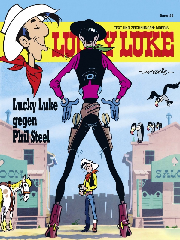 Was alles passieren kann, wenn Lucky Luke mit einem kaltblütigen Auftragskiller verwechselt wird, das müssen die Bewohner des beschaulichen Wildwest-Städtchens Bottleneck Gulch im neuen Band "Lucky Luke gegen Phil Steel" am eigenen Leib erfahren. In dem kleinen Örtchen scheint alles seinen gewohnten Gang zu gehen, bis die Idylle durch die Eröffnung des neuen Saloons "Herz As" gestört wird. Ein erbitterter Streit entbrennt zwischen dem alt eingesessenen O'Sullivan, Besitzer des Saloons "Pik As", und dem Newcomer O´Hara, Besitzer des "Herz As". Der Halunke O'Sullivan heuert schließlich den gefürchteten Profikiller Phil Steel, genannt "Spinnenbein" an, um seinen Kontrahenten ein für alle Mal aus dem Weg zu schaffen. Durch einen Zufall jedoch kommt unser Held Lucky Luke dem Ränkespiel auf die Schliche. Als Phil Steel verkleidet reist er in das ruhige Örtchen und sorgt dort für allerlei Verwirrung. Als schließlich auch der "echte" Phil Steel auftaucht, um seinen blutigen Auftrag auszuführen, ist es mit der Ruhe und Beschaulichkeit in Bottleneck Gulch endgültig vorbei. Mit nostalgischem Charme setzt Comic-Grandseigneur Morris (1923-2001) dieses frühe Abenteuer von Lucky Luke in Szene. Das Album, auf französisch erstmals im Jahre 1956 als achter Titel der Reihe publiziert, gewährt einen interessanten und höchst vergnüglichen Blick auf die Entwicklung der bis heute erfolgreichsten Western-Parodie. Noch ohne die Hilfe seines kongenialen Partners René Goscinny erstellte der geistige Vater von Lucky Luke für dieses Album Handlung und Text im Alleingang. "Lucky Luke gegen Phil Steel" ist nicht nur für junge Leser ein kurzweiliger Spaß, sondern auch als feinsinnige Parodie ausgesprochen interessant. Schließlich präsentiert sich der eiskalte Revolverheld Phil Steel als alter Bekannter: Morris gestaltet ihn als treffende Karikatur des US-Leinwandstars und Westernhelden Jack Palance (1919-2006), der mit dem Film "Mein großer Freund Shane" in diesen Jahren seine Weltkarriere begründete.